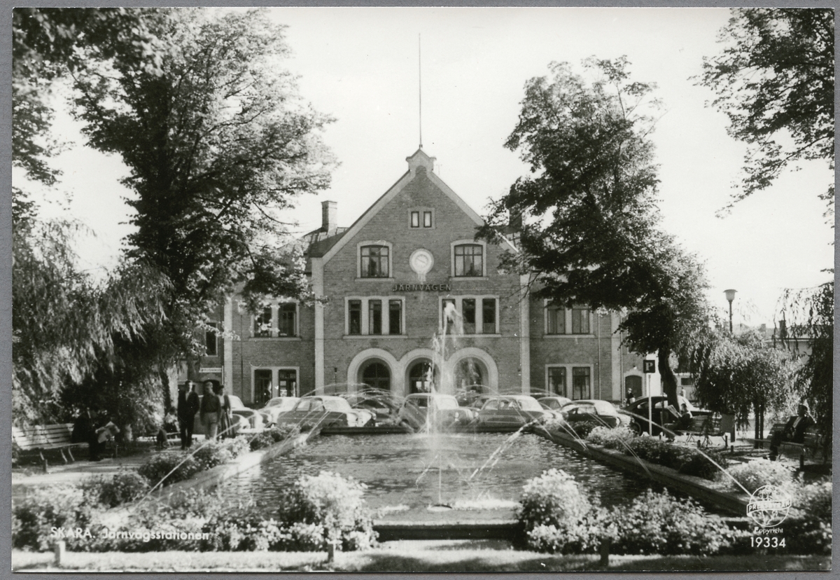 Titel: Stationshuset i Skara med 1950-tals bilar i förgrunden.