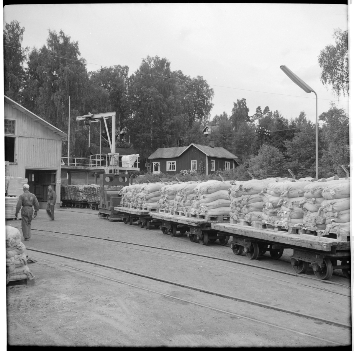 Vid papersbruket i Håverud ses ett Simplexlok kopplat med flakboggivagnar utanför magasinet i Håverud.