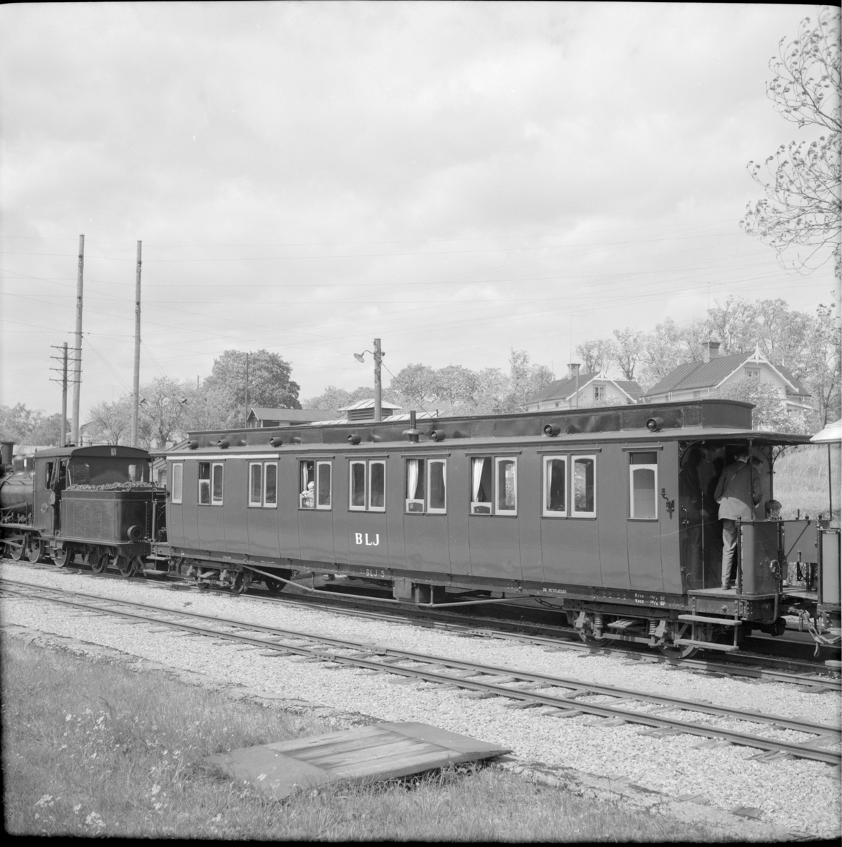 Byvalla - Långshyttans Järnväg, BLJ lok 5 "Thor" och BLJ personvagn 5 med resande på station.