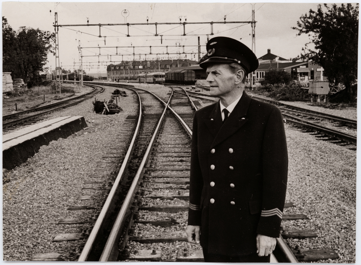 Titel: Porträtt av stins Robert Johnsson i Arboga. I bakgrunden ser vi Albin Rapp Konfektionsfabrik.