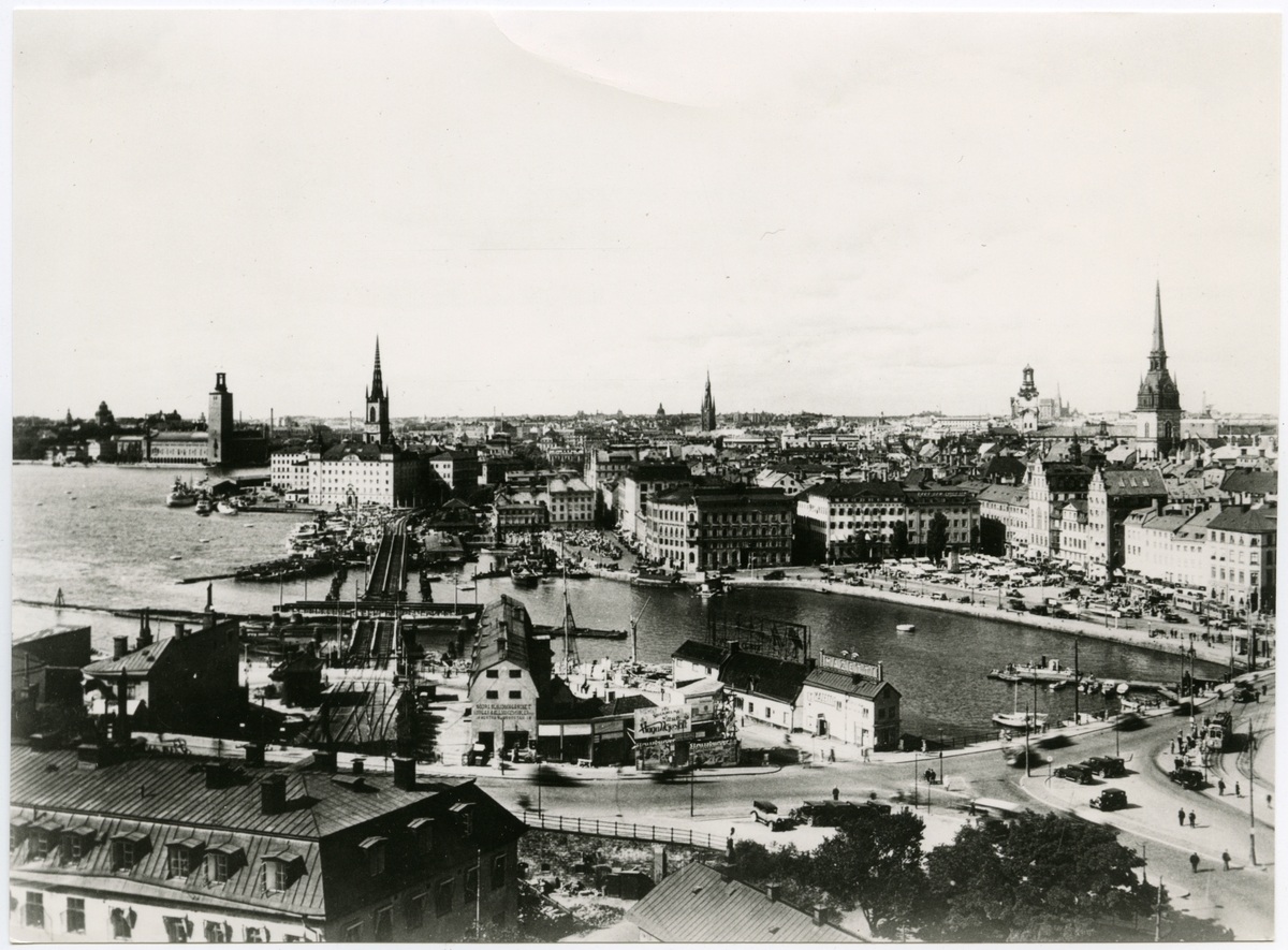 Statens Järnvägar, SJ, Stockholm utsikt från Katarinahissen 1930, innan slussbygget påbörjades och hissen rivits. Denna utsikt är numera historiskt. (bilden köpt 1935 från Svenska Turistföreningen.) Gamla riksdagshuset flygel mot Mälaren påbyggd och fullbordad år 1908 efter ritningar av Aron Jonsson. Uppgift från Stadsmuseets bildarkiv. 1956 06 12. Södra slöjdmagasinet och Mazettie ligger till höger om järnvägen.