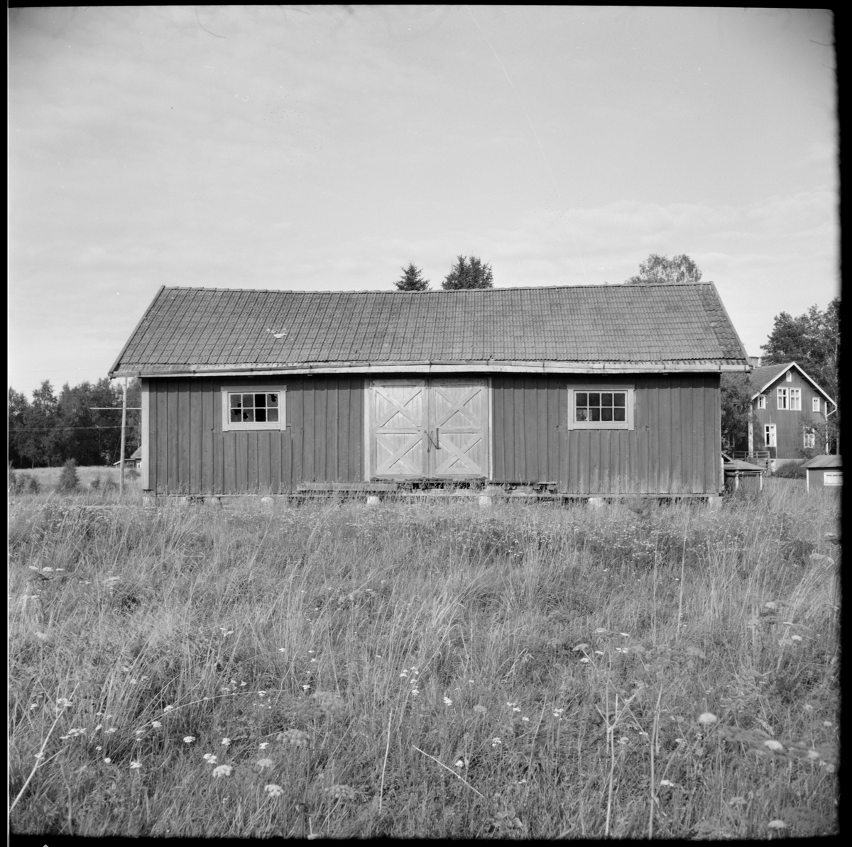 Vid utfarten av den nedlagda järnvägsstationen i Vireda ses en husbyggnad.
