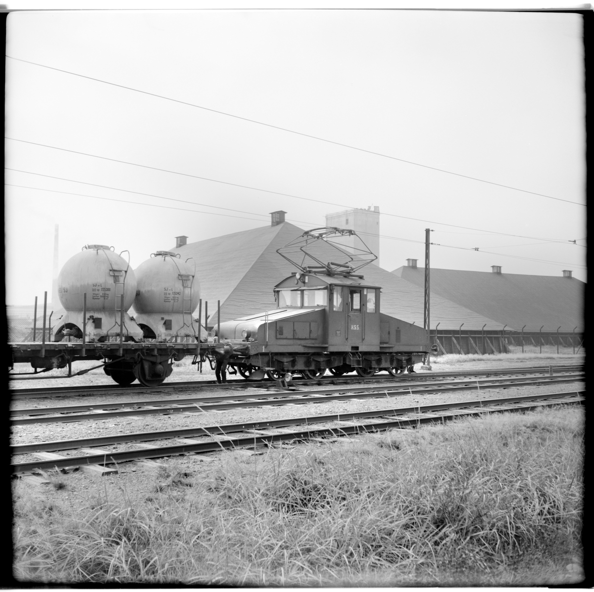 Helsingborgs Stads Spårvägar, HSS lok 1 med godståg utanför Kopparverket på väg mot Statens Järnvägar, SJ.