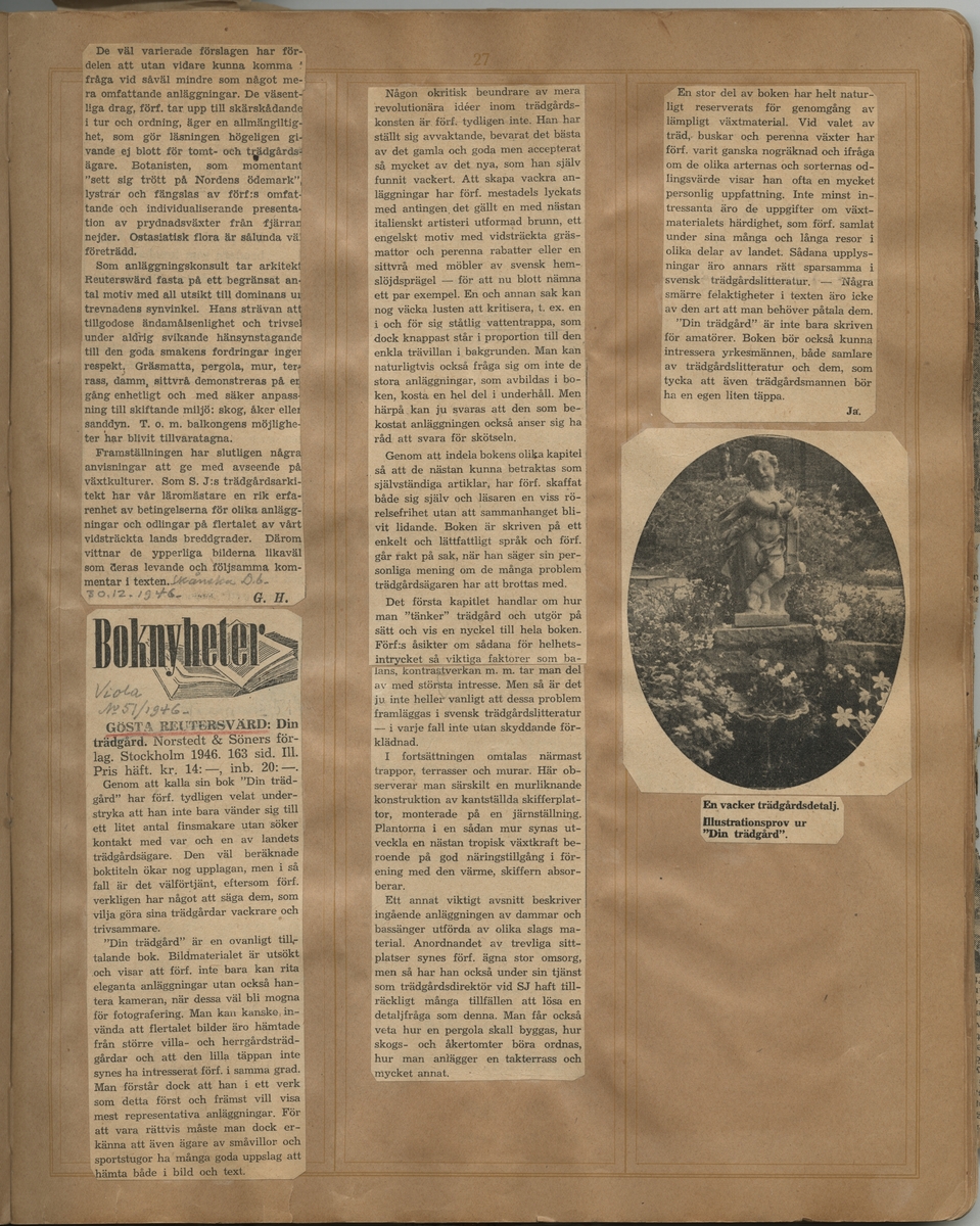 Tidningsklipp ur "Uppsatser om trädgårdar m.m. som på ett eller annat sätt beröra Gösta Reuterswärd. Samlade av Ernst Hj."