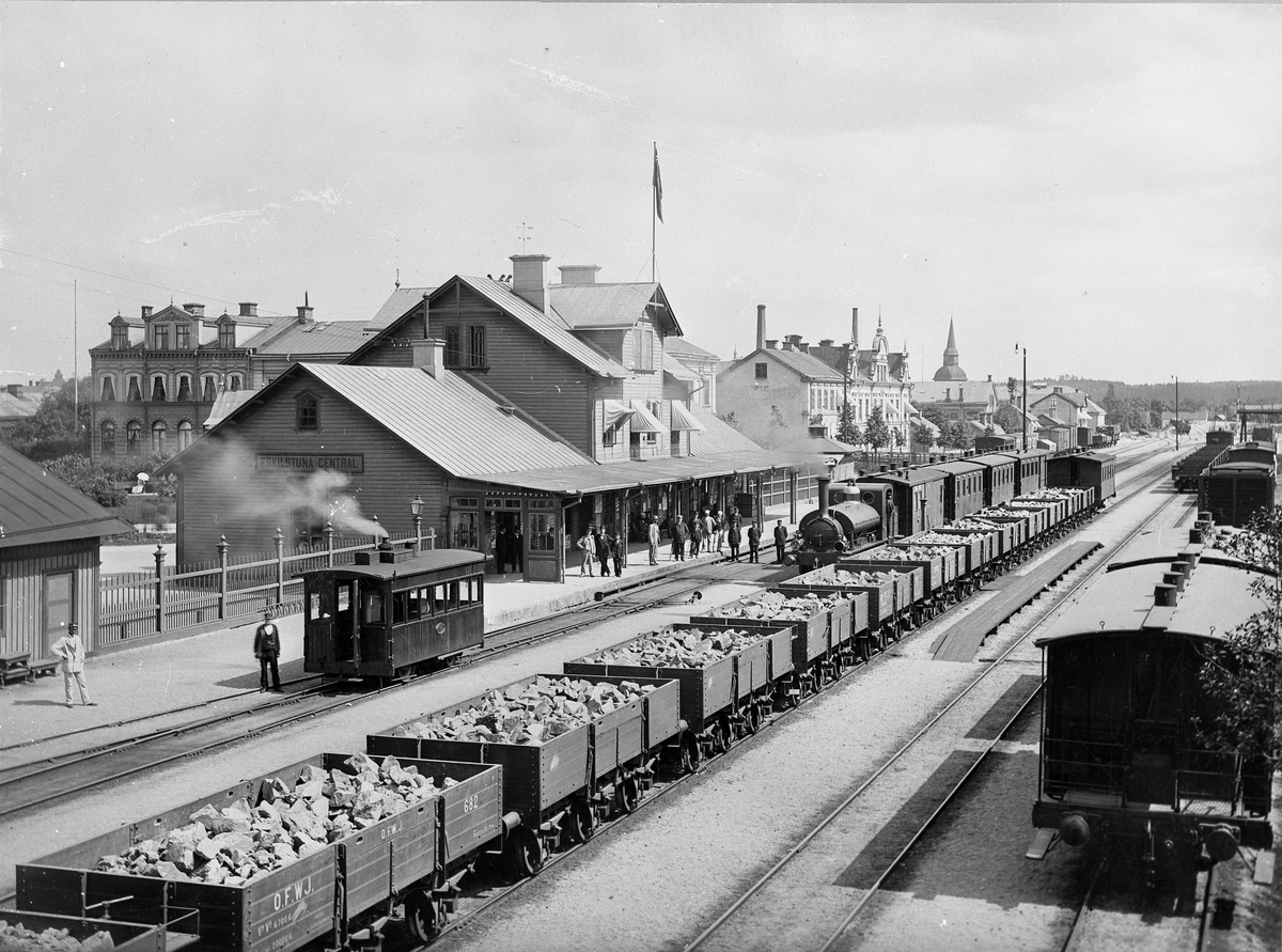 Eskilstuna Centralstation. Stationen byggdes av Oxelösund - Flen - Västmanlands Järnväg, OFWJ, 1876. Namnet Eskilstuna Central tillkom 1895 då Norra Södermanlands Järnväg öppnade Eskilstuna Norra och Esilstuna Södra station.