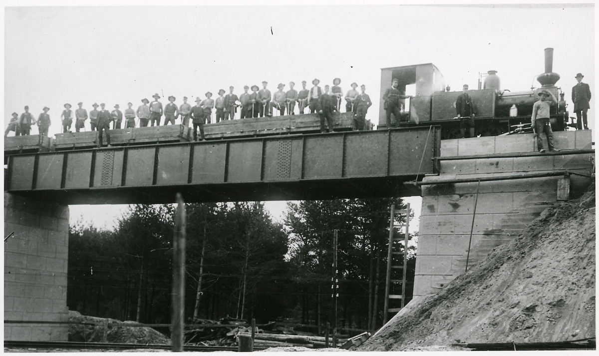 Stockholms Roslagens Järnvägar, lok SRJ 33 drar här ett gruståg vid arbetet med byggandet av Väderstad - Skänninge - Bränninge Järnväg. Här vid viadukten över statsbanan Mjölby - Hallsberg på linjen mellan Skänninge och Ingridsdal där man stannat för fotografering.