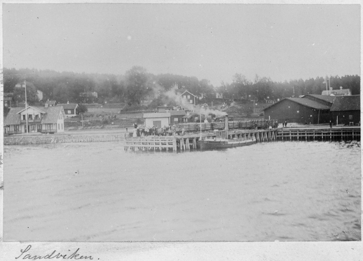 Sandvikens kaj och stationshuset i Kolmården. Bogserbåten "Express" ligger vid bryggan, timmervagnar och resande står på bryggan. Bilden är tagen från sjön.