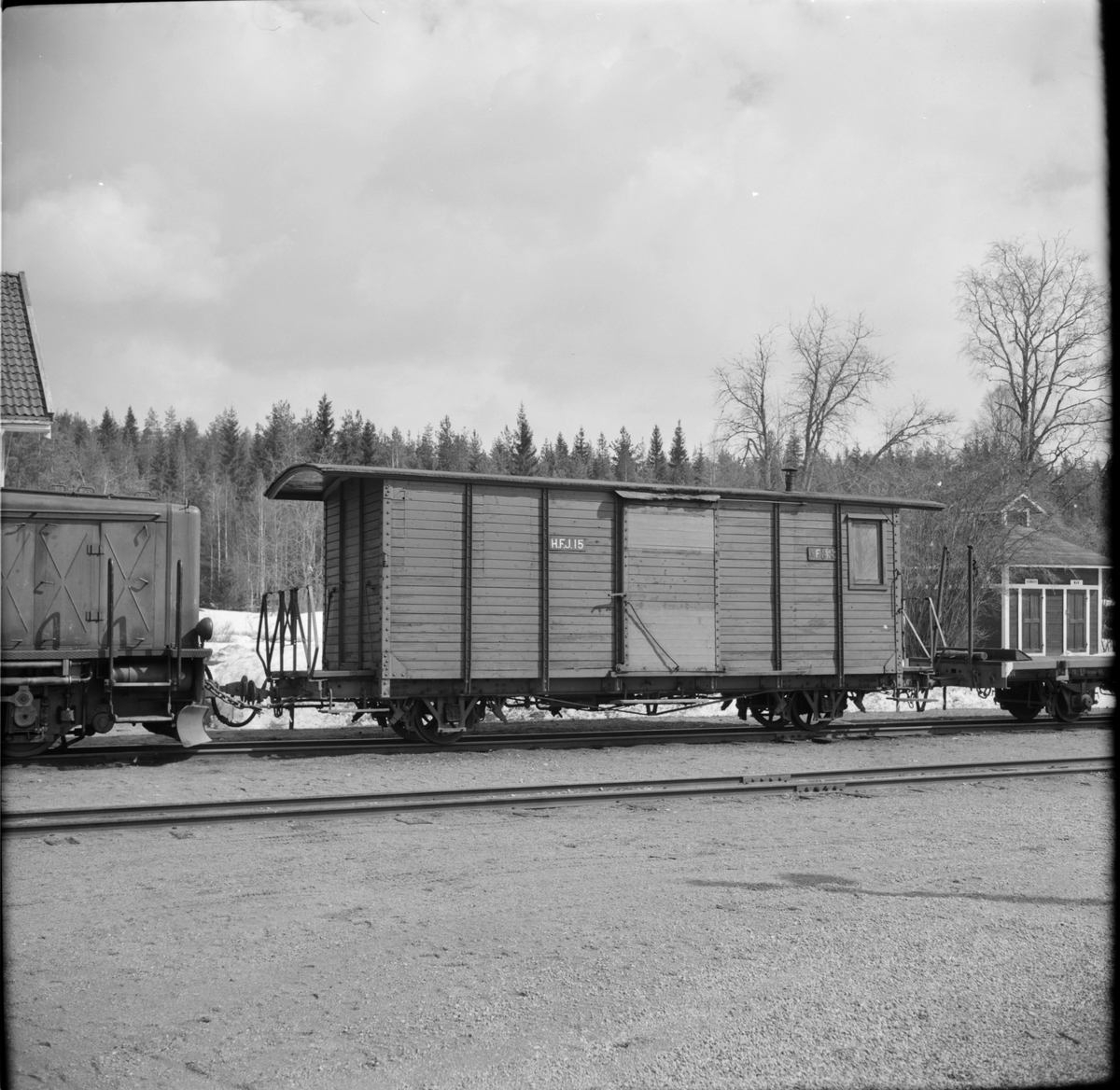 Hällefors - Fredriksbergs Järnväg, HFJ godsvagn 15 i Gravendal. Dasset skymtar till höger i bild.