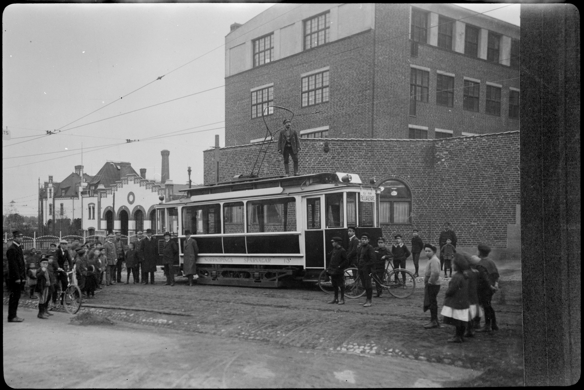 Personal på taket, barn och personal bredvid Norrköpings Kommunala Affärsverk, NKA Mä 13 utanför spårvagnshallen, Östra station i Norrköping.