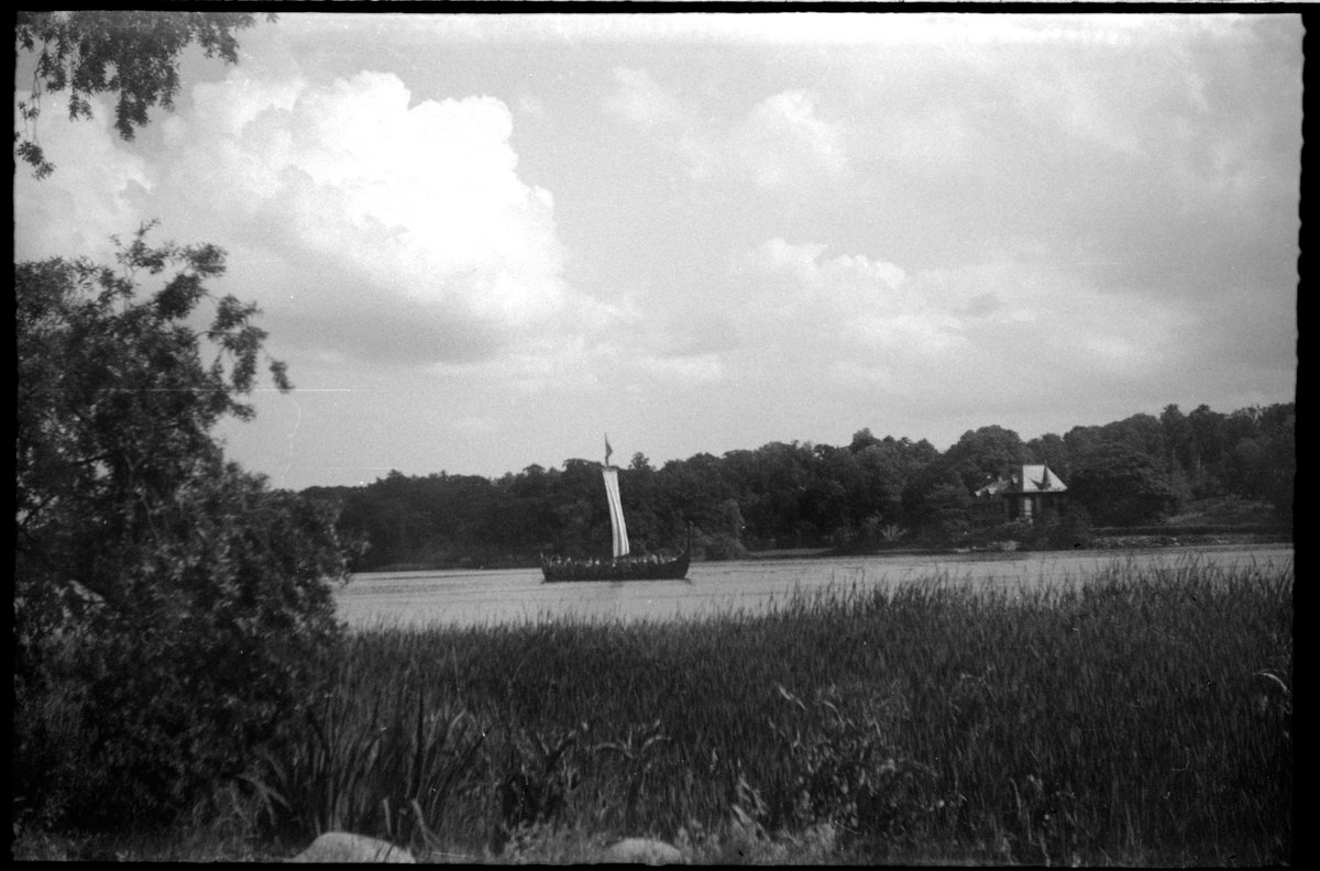 Passagerare i en båt i vikingastil med hissat segel.