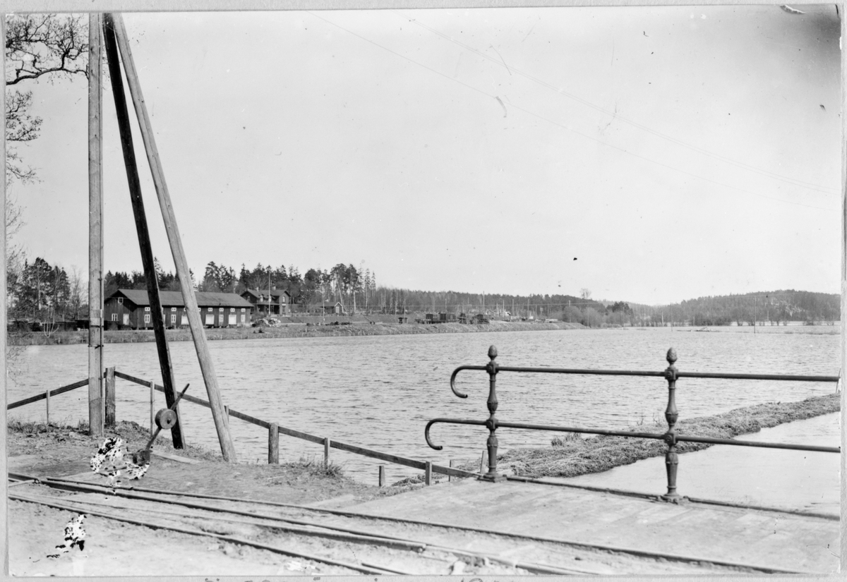 Åkers styckebruk stationsområde i bakgrunden och en översvämning av åkermark vid järnverkets industrispår.