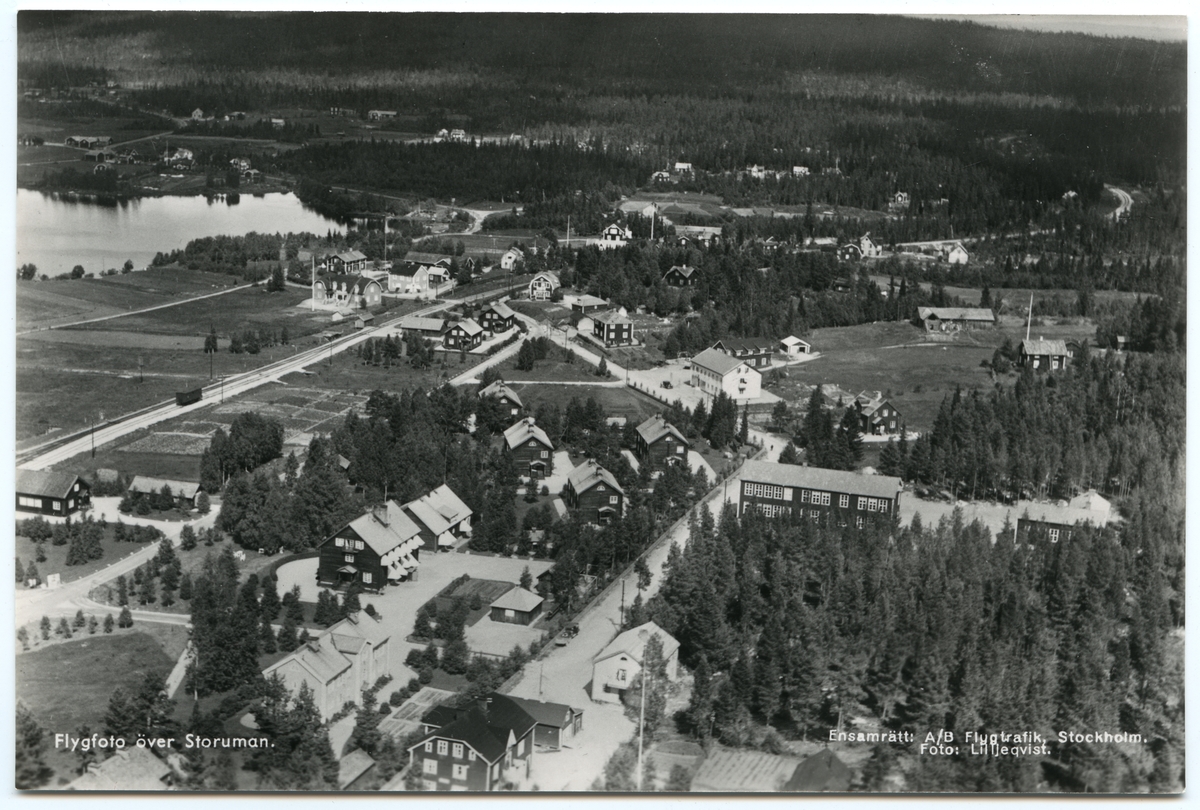 Vykort från förlag Conr. Andersson Pappershandel, Storuman. Flygfoto över Storuman.