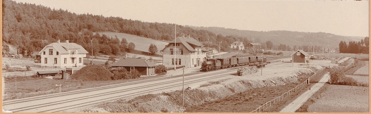 Vy över Svenhögen station Ett tågset bestående av ånglok, passagerarvagn och godsvagn befinner sig utanför stationen