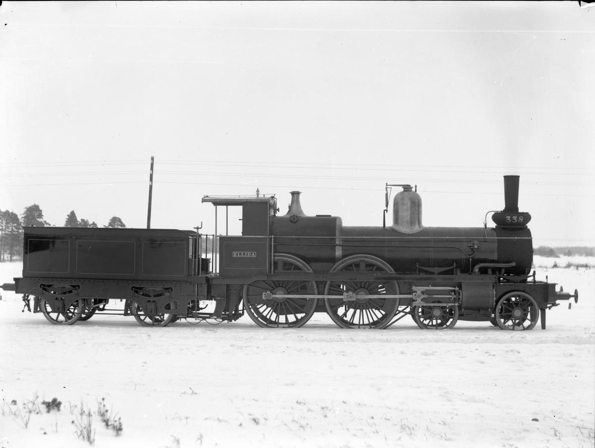 Statens Järnvägar, SJ Cb 338. Fick namnet Ellida. Loket tillverkades av Nohab och hade högsta hastighet 90 km i timme. Man kan se att pannan var för liten. Loket blev inte framgångsrik därför det byggdes 1903 om till SJ Cc 338. Loket slopades och skrotades på 1920-talet. Den här bilden är troligen tagen vid leveransen.