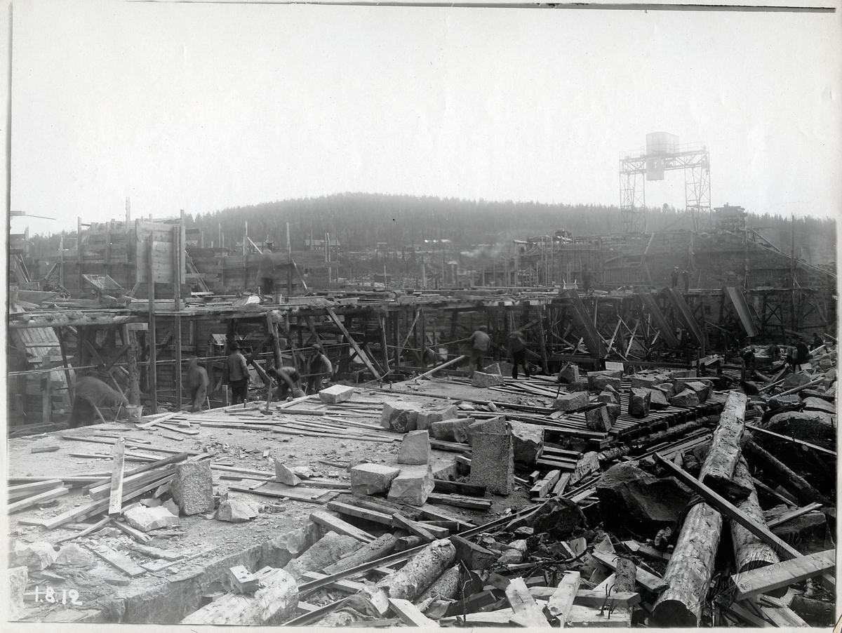 Porjus kraftverk under byggnation. Arbetslag i arbete med lilla skibordet.