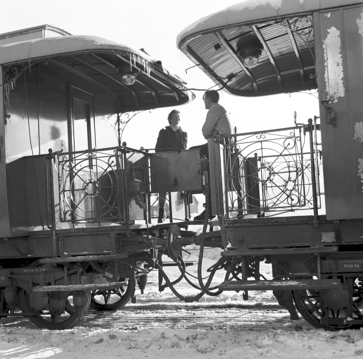 Vagnarna är Statens Järnvägar, SJ So7 1272 sällskapsvagn till vänster, So7 1275 matsalsvagn. Trots att vagnarna ursprungligen var likadana har plattformarna senare blivit olika.