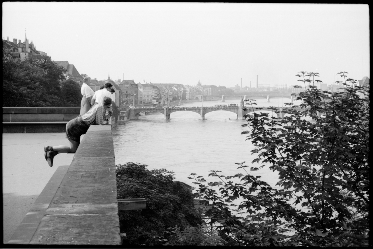 Vy över Mittlere Brücke en bro i Basel som är en av de äldsta Rhenövergångarna mellan Bodensjön och Nordsjön. Bilden är tagen utanför Minster kyrkan i Basel.