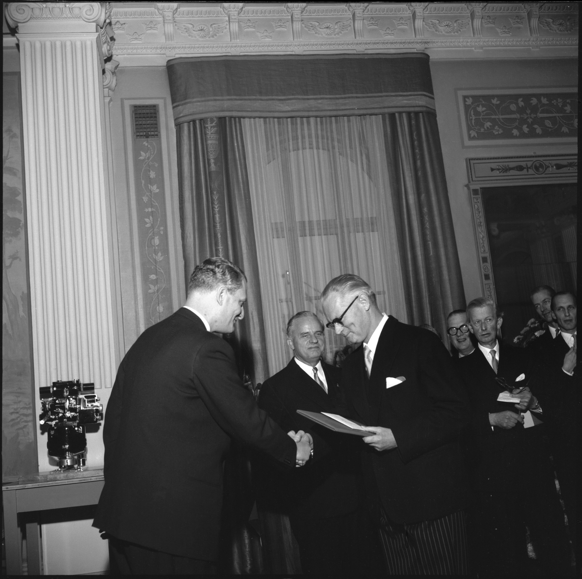 Generaldirektör Erik Upmark tar emot gåvor från Stockholms Saltsjöns järnvägar SSnJ, NOHAB, St. Kopparberg, Kockums, LME.