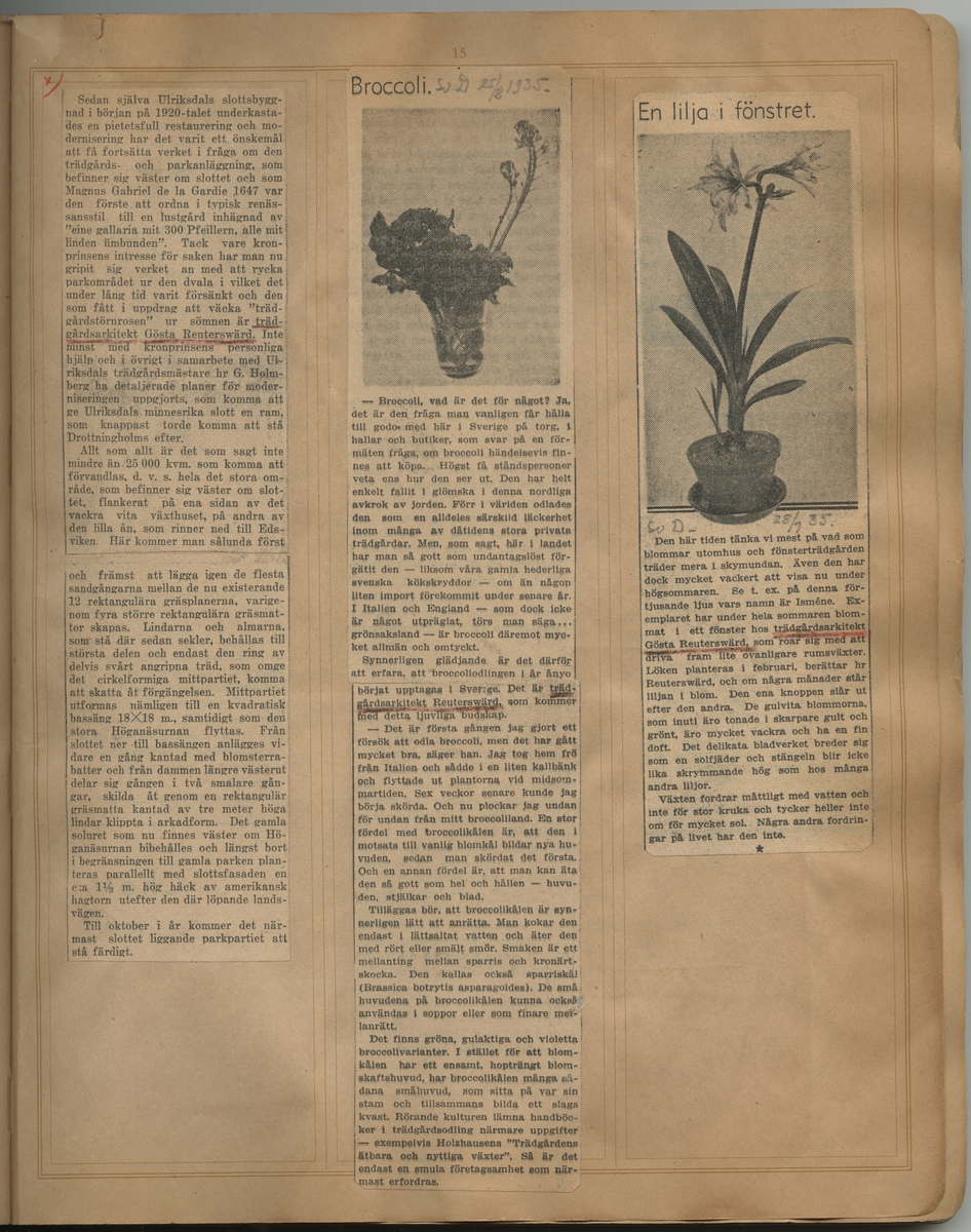 Tidningsklipp ur "Uppsatser om trädgårdar m.m. som på ett eller annat sätt beröra Gösta Reuterswärd 1931-1943".