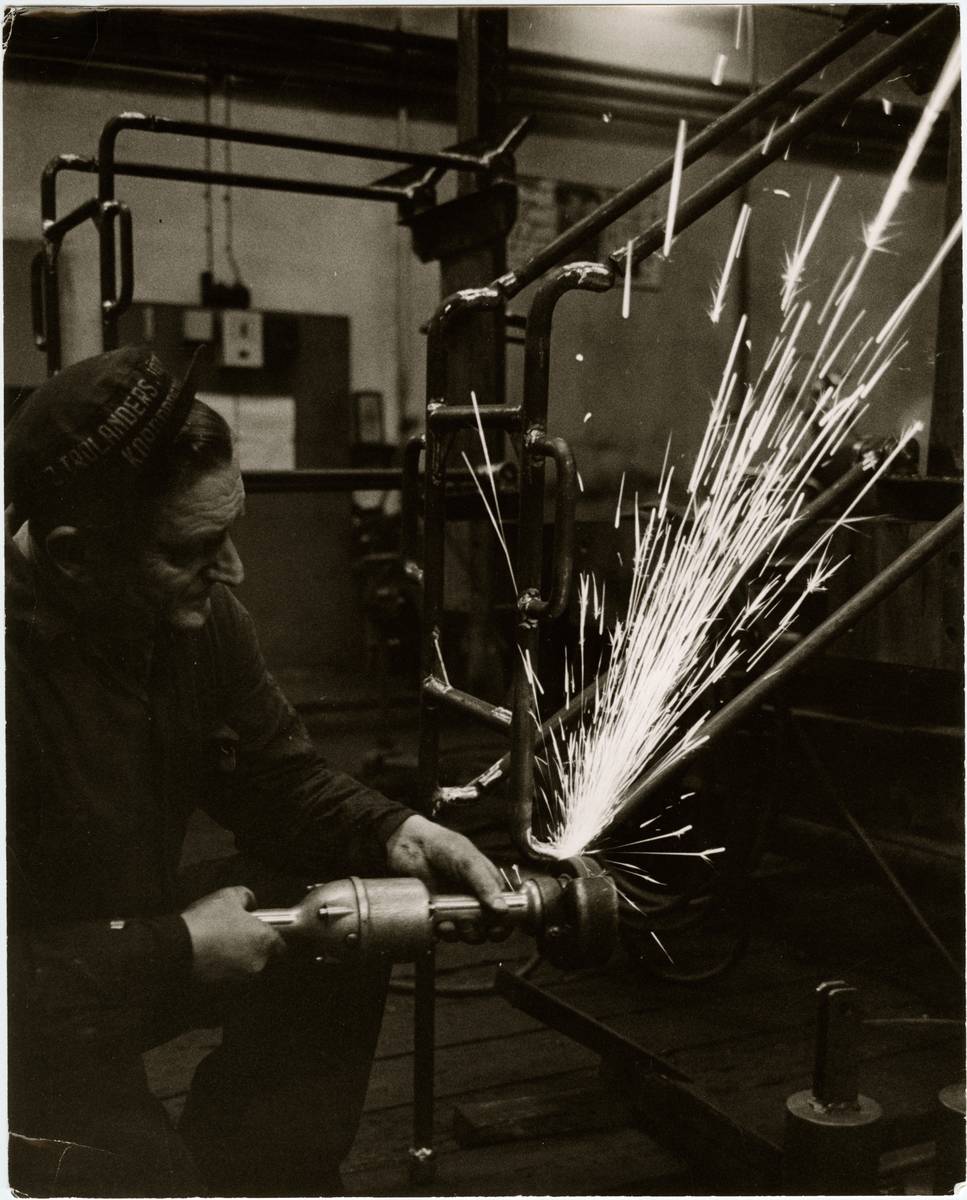 Karl-Anton Fransson slipar en konstruktion vid Trafikaktiebolaget Grängesberg - Oxelösunds Järnvägar, TGOJ verkstad i Kopparberg.