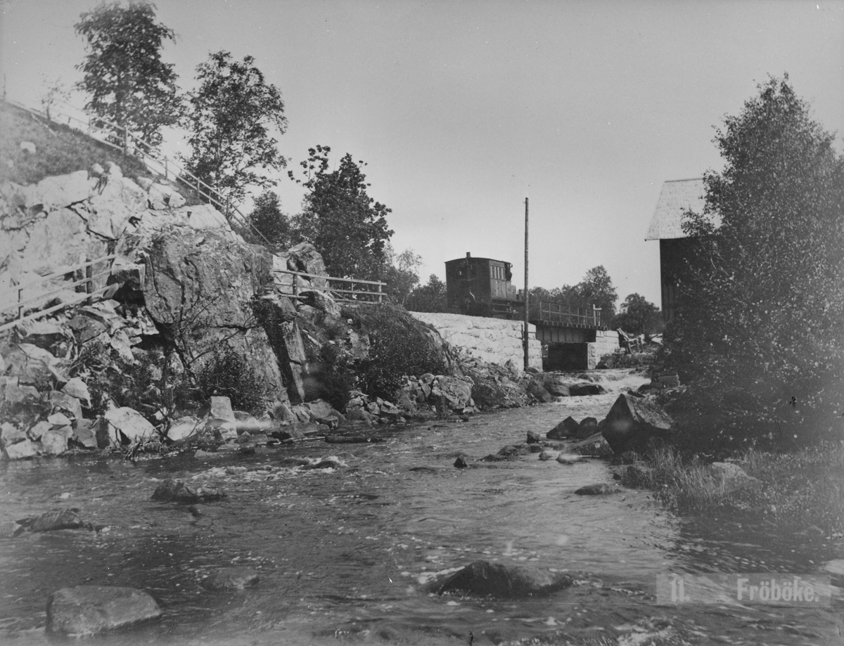 Halmstad-Bolmens Järnväg, HBJ vagnlok 4 "Lärkan" kör över bron vid Fröböke. Loket har en personkupé och är ett så kallat vagnlok. Loket tillverkades 1888 av Nohab och skrotades 1934.