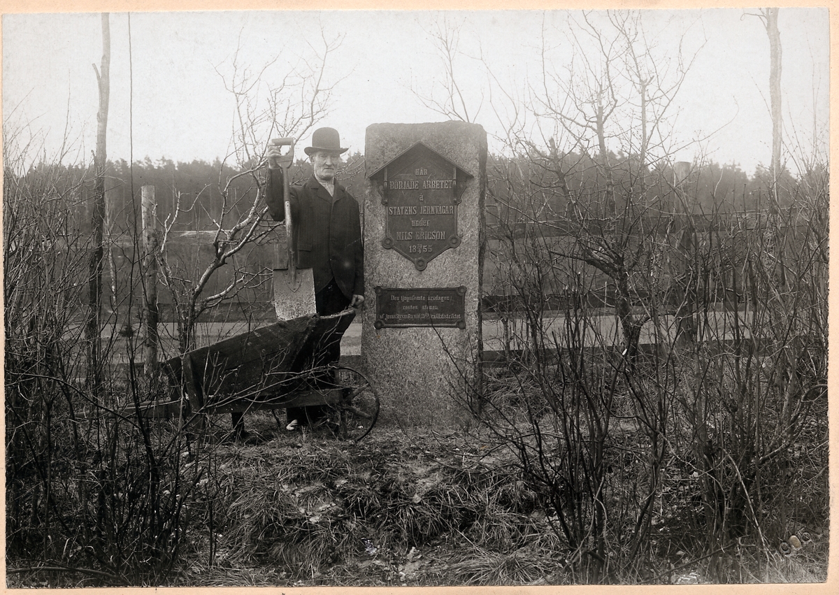 Rallare Per August Skog vid minnesstenen över första spadtaget för Västra Stambanan, den så kallade Skaverydstenen.