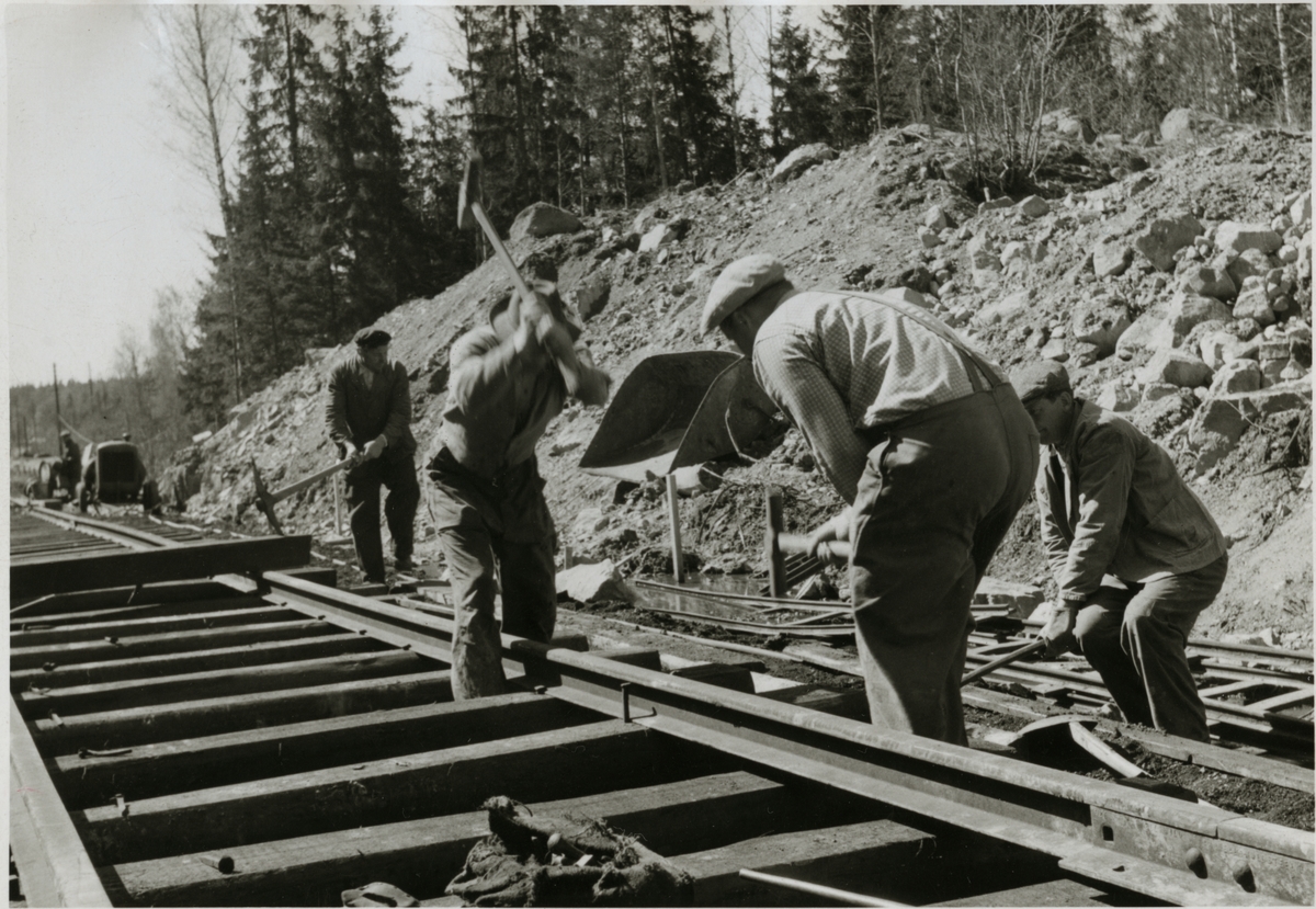 Spårläggning pågår vid en skärning på Trafikaktiebolaget Grängesberg - Oxelösunds Järnvägar, TGOJ:s spår.