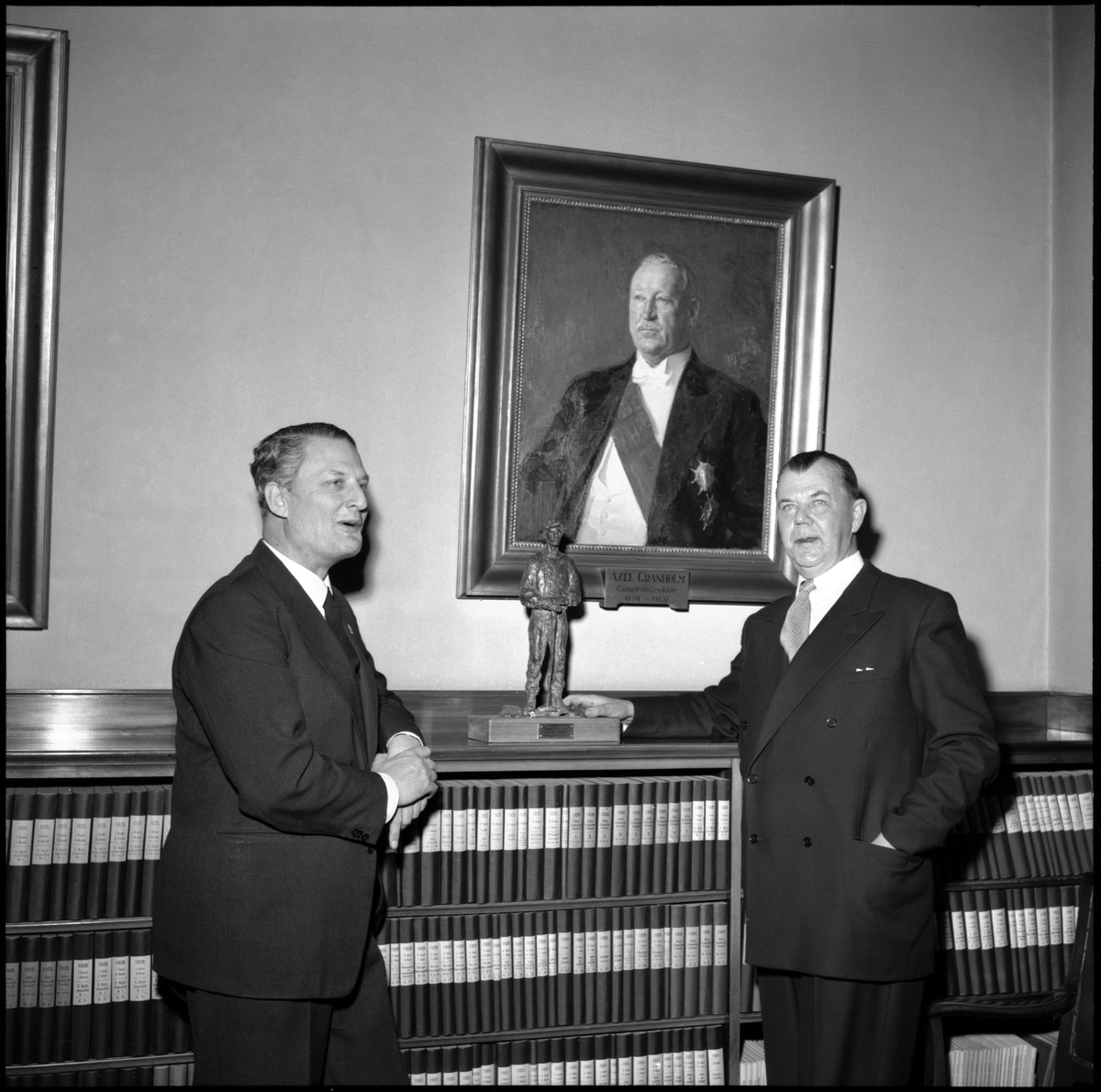 Jernbanedirektör Leif Tveten vid överlämnandet av Norske Stadsbanor, NSB gåva till Statens Järnvägar SJ Generaldirektör Erik Upmark. En rallare i brons, en av de mera uppmärksammade jubileumsgåvorna.