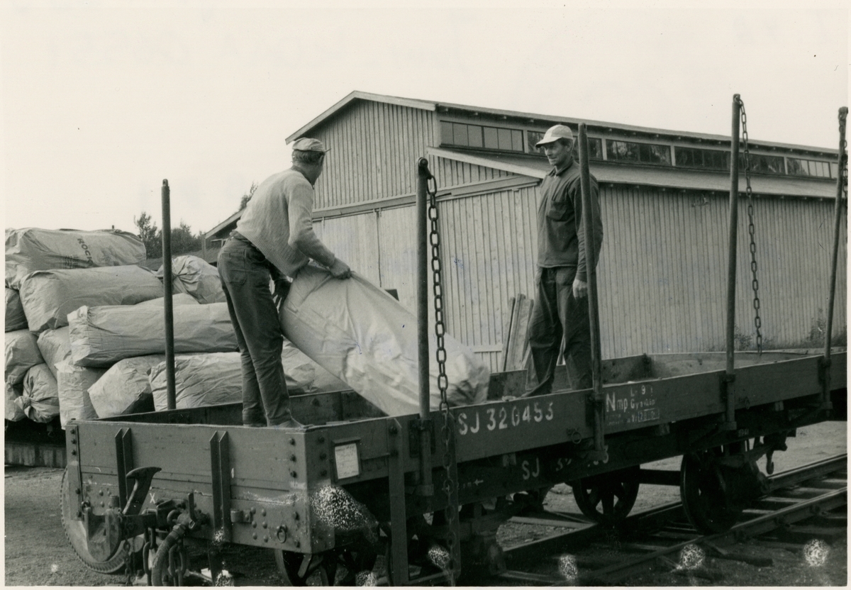 Vetlanda - Sävsjö Järnväg, HvSJ, Godsvagn SJ 320453 Nmp, Lossning av Rockwool till AB egna hem Myresjöhus. Myresjöhus. Nedlagd av bandelen Sävsjö Vetland Målila. 1961-09-01.