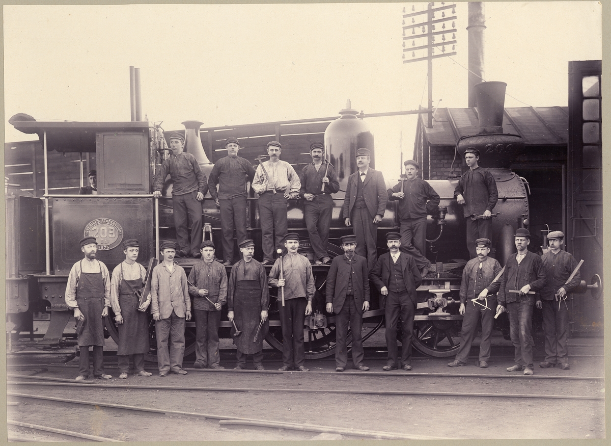 Personal på vagnverkstaden i Hälsingborg med sina verktyg och instrument i händerna. På baksidan Sveriges statsbanors tidtabell fr o m 1 oktober 1898.