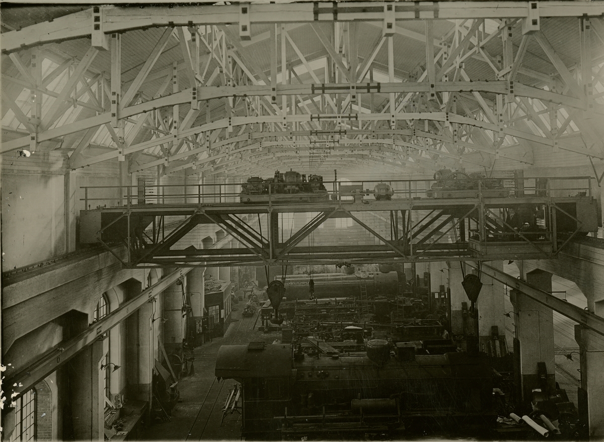 Titel: Huvudverkstaden vid Malmö station. Östra maskin uppsättningsskeppet med 80-tons lyftkran.
