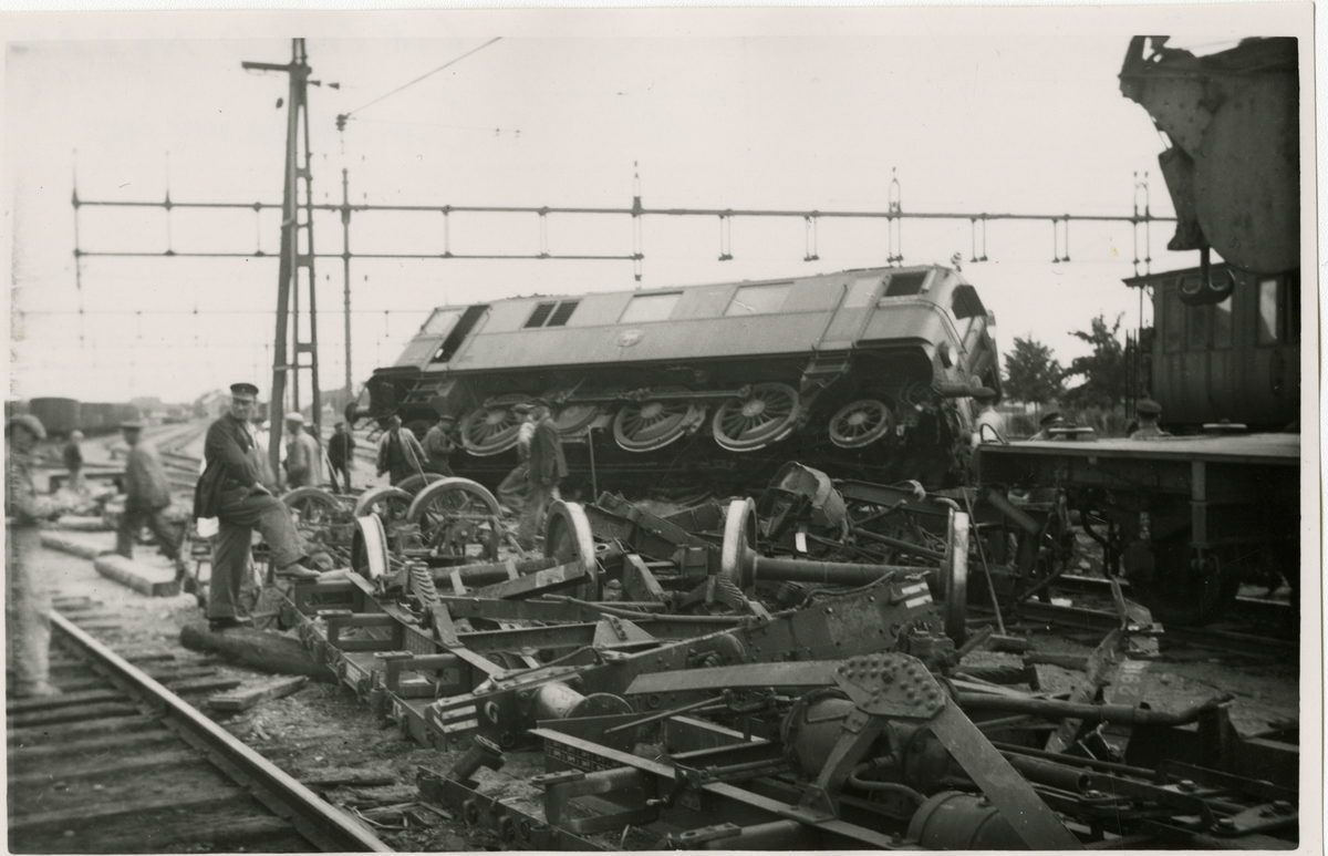 Godståg 4227 urspårar vid Uppsala central den 14/9 1939. Statens Järnvägar, SJ Dg 385.