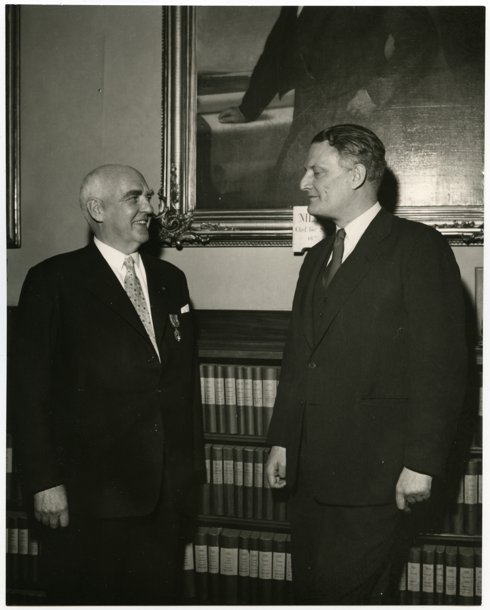 Distriktschef R Markland Malmö avtackas av Generaldirektör E Upmark i plenisalen och på Försvarsbyrån, Stockholm 1956 12 28.