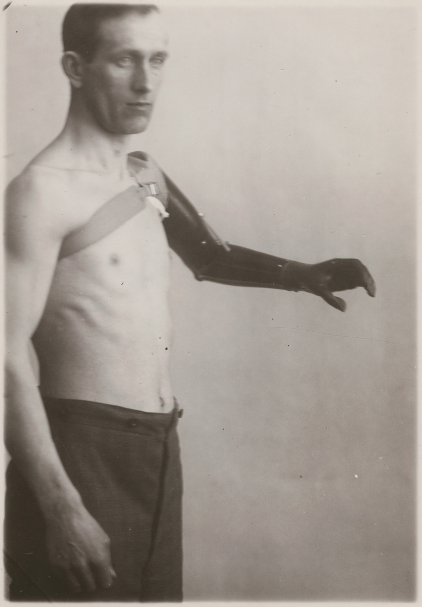 Titel: Fotografi från "Redogörelse för tillverkning vid Statens Järnvägars protesverkstad i Nässjö", 1932. Visar armprotesens rörelseförmåga och användbarhet.