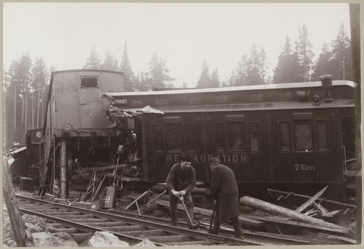 Arbete vid olyckplats efter järnvägsolycka vid Buddby.