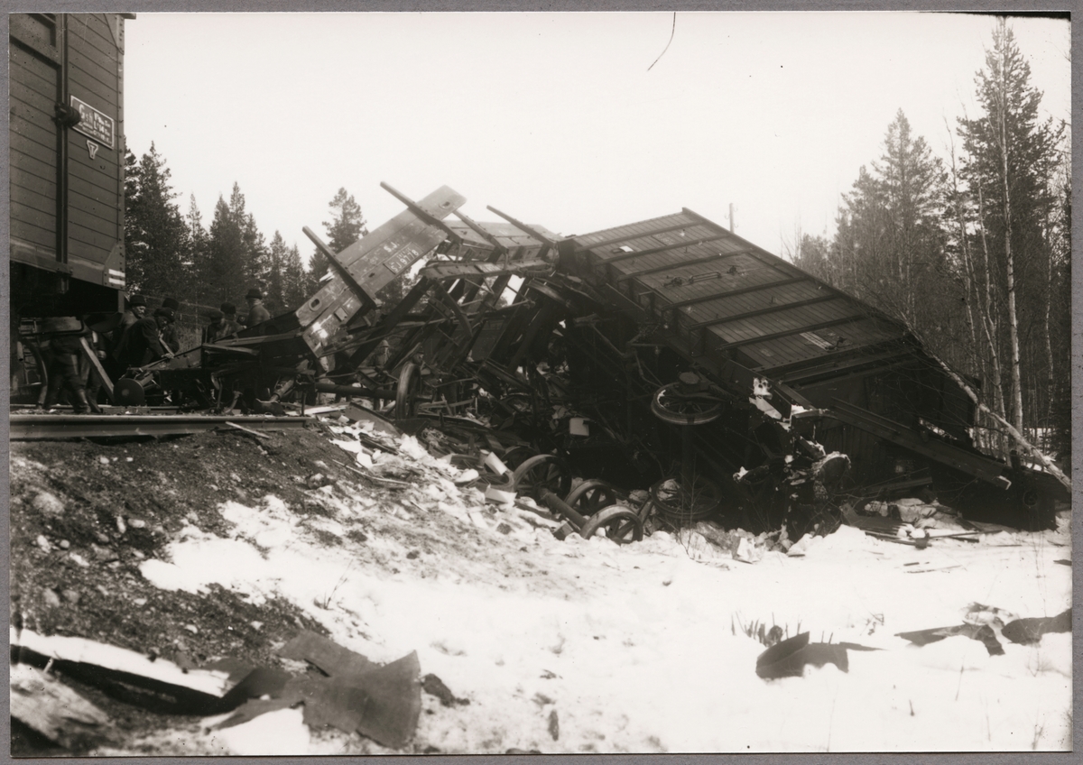 Titel: Liggande godsvagn efter olycka mellan Gastsjön och Kälarne i Jämtland på 1920-talet.