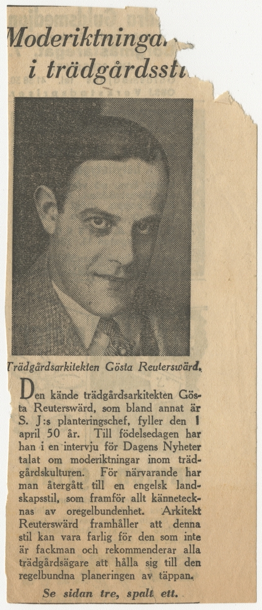 Tidningsklipp ur "Uppsatser om trädgårdar m.m. som på ett eller annat sätt beröra Gösta Reuterswärd 1931-1943".