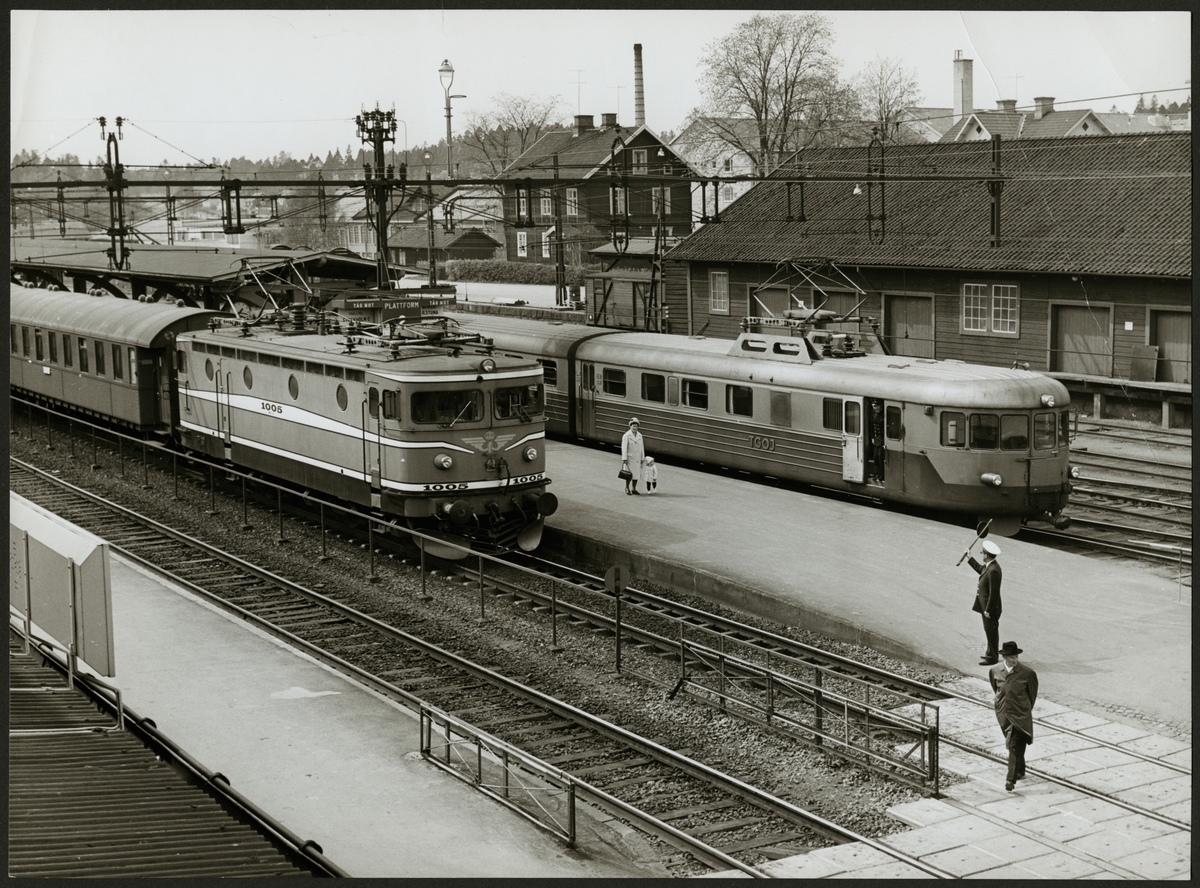 Statens Järnvägar, SJ Rb 1005 och Trafikaktiebolaget Grängesberg - Oxelösunds Järnvägar, TGOJ motorvagnståg Yoa202 som senare fick beteckningen X21 vid stationen i Flen maj 1964.
