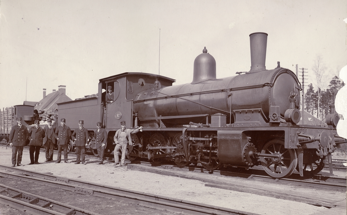 SWB 52 Räv med tåg nr 302 i Fagersta 1913. Lokpersonal är Lokförare Petrus Brandt, Lokeldare Carl Verner Areén,