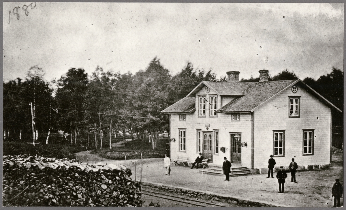 "Dalum har haft två stationshus bredvid varandra. Det första byggdes av UJ (Ulricehamns Järnväg, "smalspåret"), som öppnades för trafik 1874.