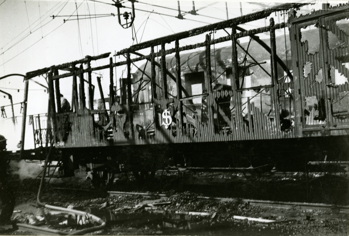 Demolerad personvagn efter explosionen av ett tyskt ammunitionståg på Avesta Krylbo station.