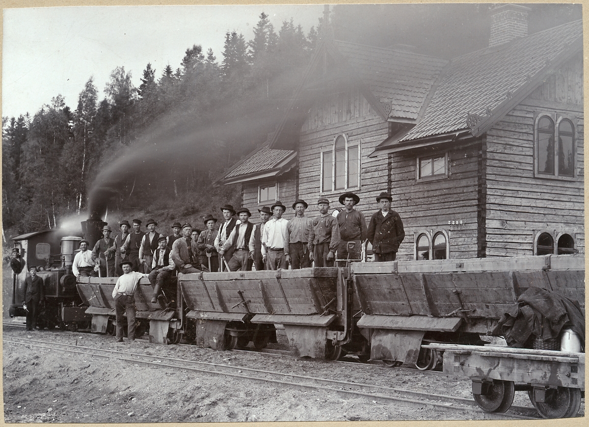 Gruståg med banbyggnadspersonal vid Brötjemarks station. Jönköping - Gripenbergs Järnväg, JGJ lok 3.