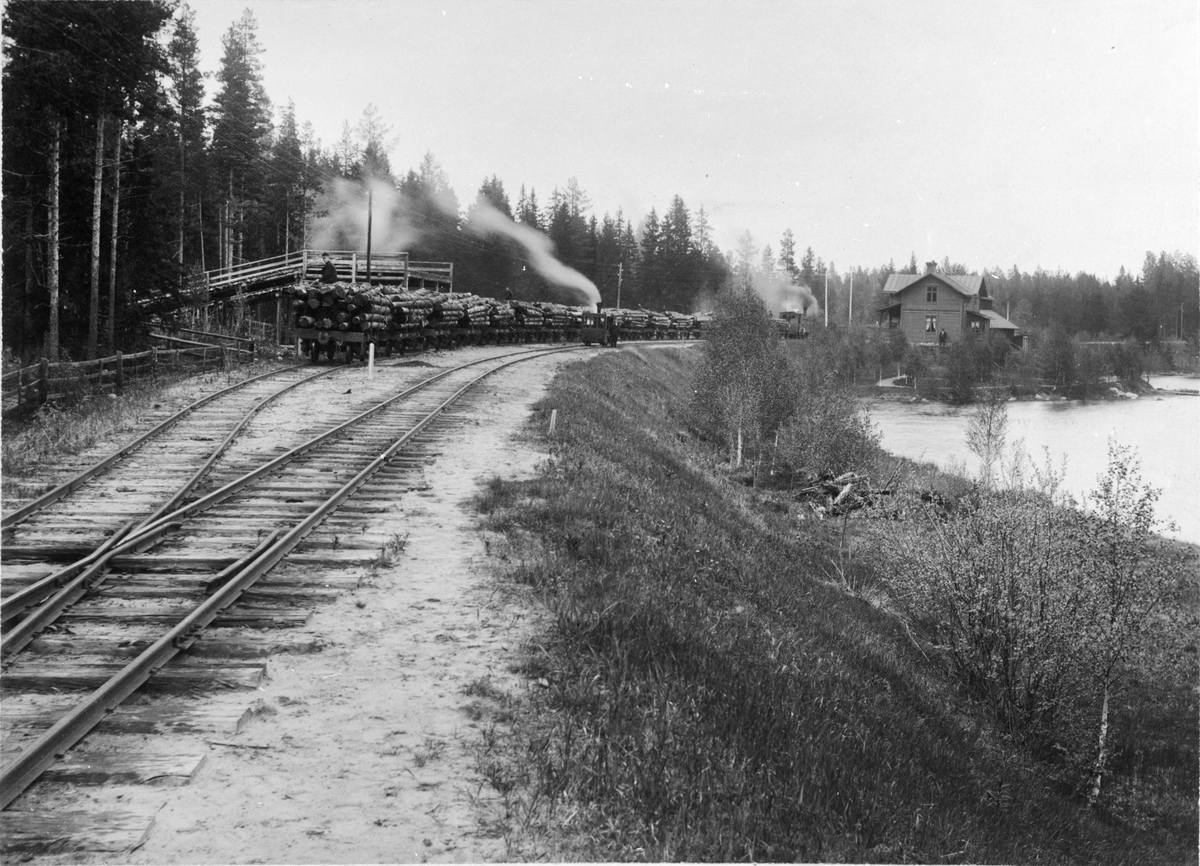 Trafikplats anlagd 1897. En- och en halv vånings stationshus i trä. Observera bromsarna som sitter uppe på de lastade vagnarna. DONJ lok 6 "Linghed" och ångdressinen "Huppen".