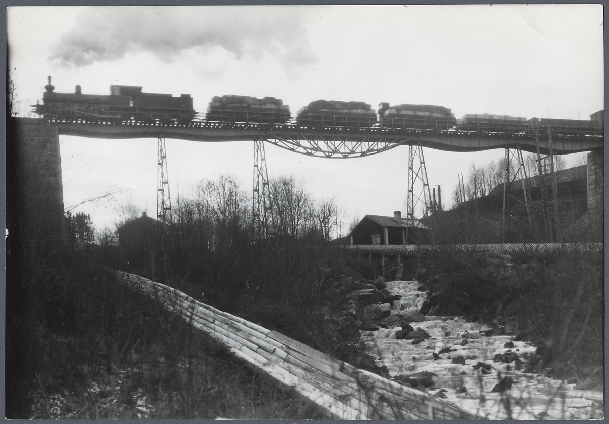 Härnösand - Sollefteå Järnväg, HdSJ, godståg passerar på Järnvägsbron över Bruksån. Flottningsränna och en vattentub.