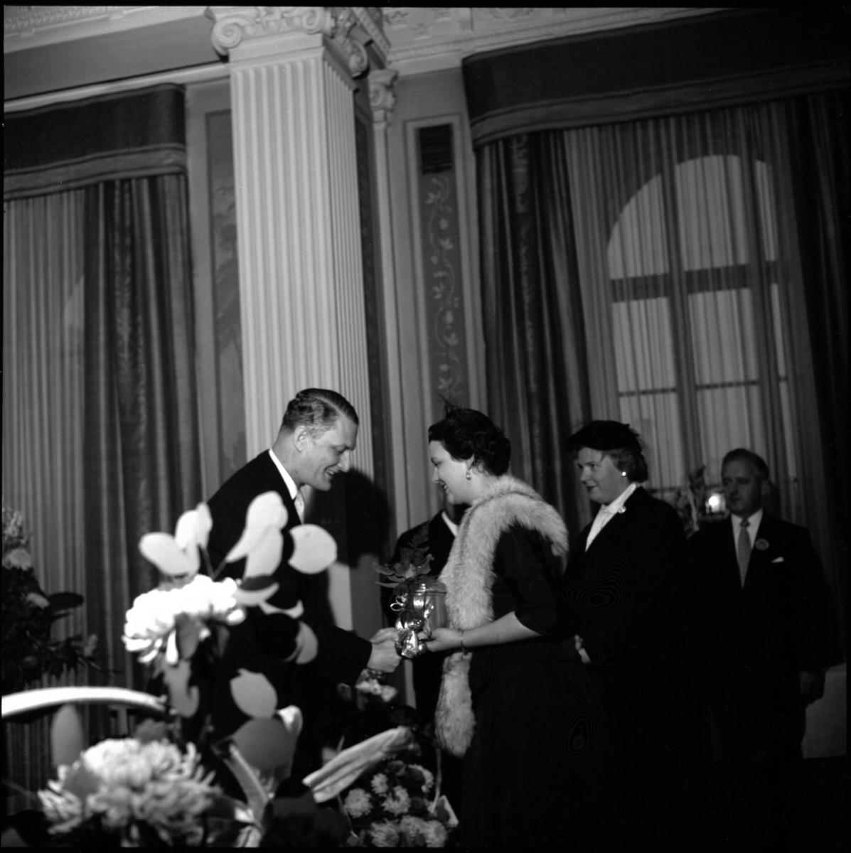 Generaldirektör Erok Upmark tar emot gåvor från Telestyrelsen.
