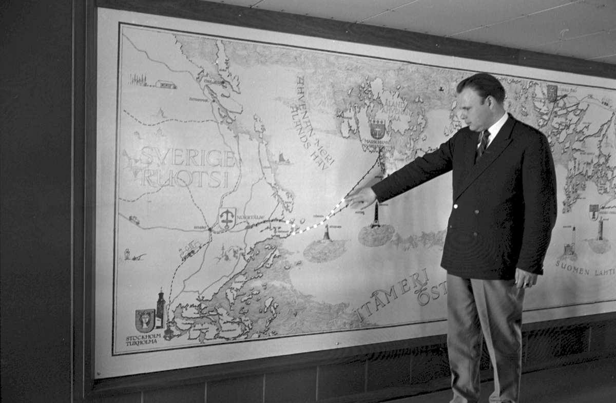 Ålandsresa. M/S Nordia. Man vid sjökort med färdväg