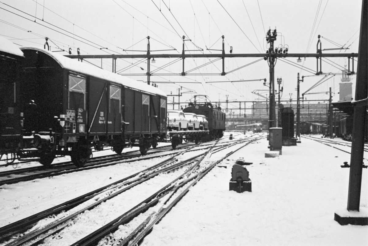Stockholm Centralstation, vinterbild. Klarabergsvidukten och Stadshudet i bakgrunden.