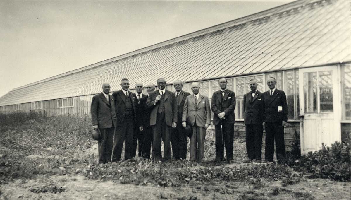 10 herrar framför Bröderna Björklunds nejlikeodlingar vid Hammarslunds station under resa 6/6 1945 över förutvarande CHJ.