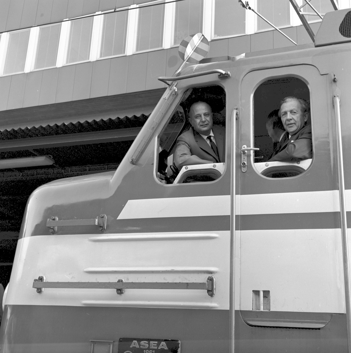 Statens Järnvägar, SJ Ra 994 "Rapid 10". Jugoslavisk delegation. Från SJ Ekonomidirektör, Ekd, A. Sjöberg och från Kommunikationsdepartementet Kommunikationsminister, Kom.min, Gösta Skoglund
