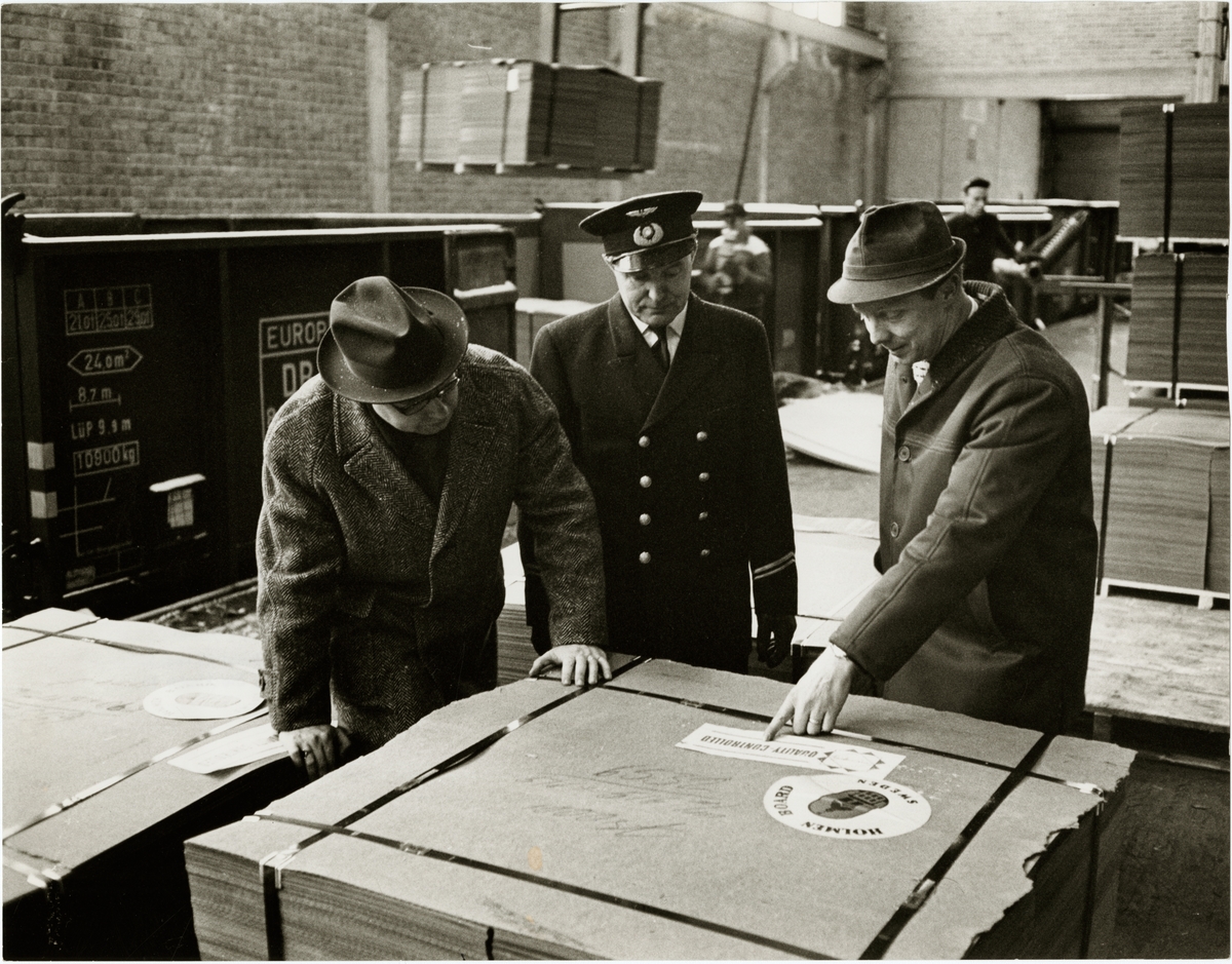 Emil Klerhult, platsföreståndare vid stationen i Vrena, diskuterar lastningsfrågor med från vänster planeringsman Weine Seger och utlastningsförman Rune Tingsborg vid Holmens Bruks fiberplattfabrik.